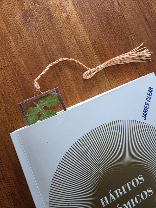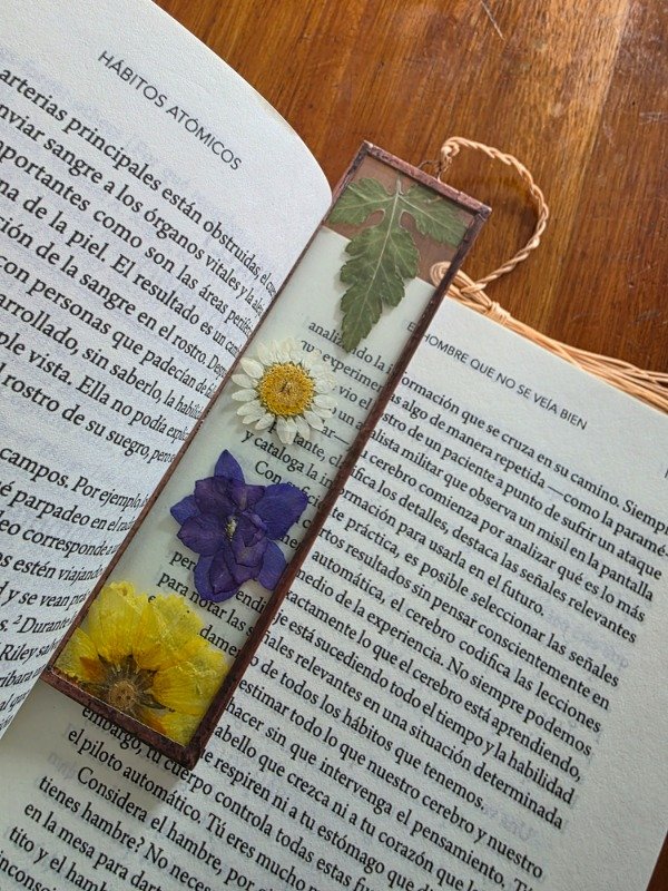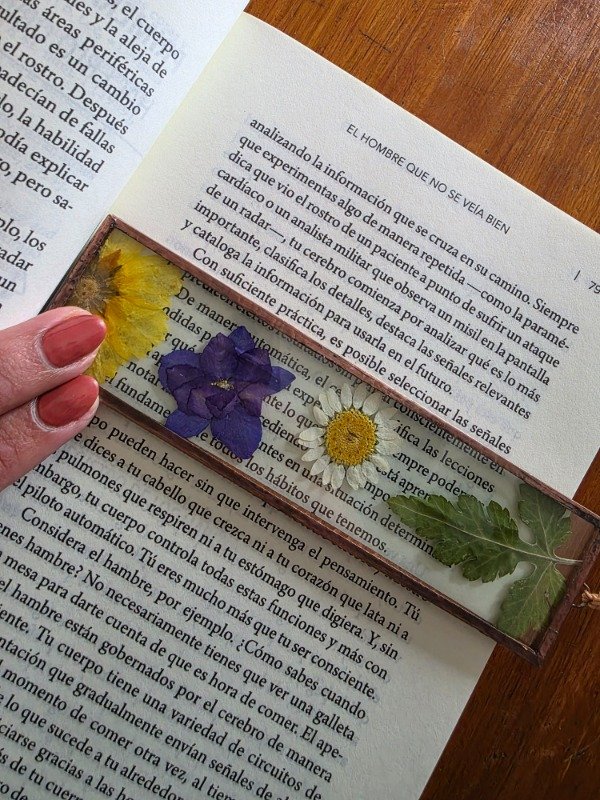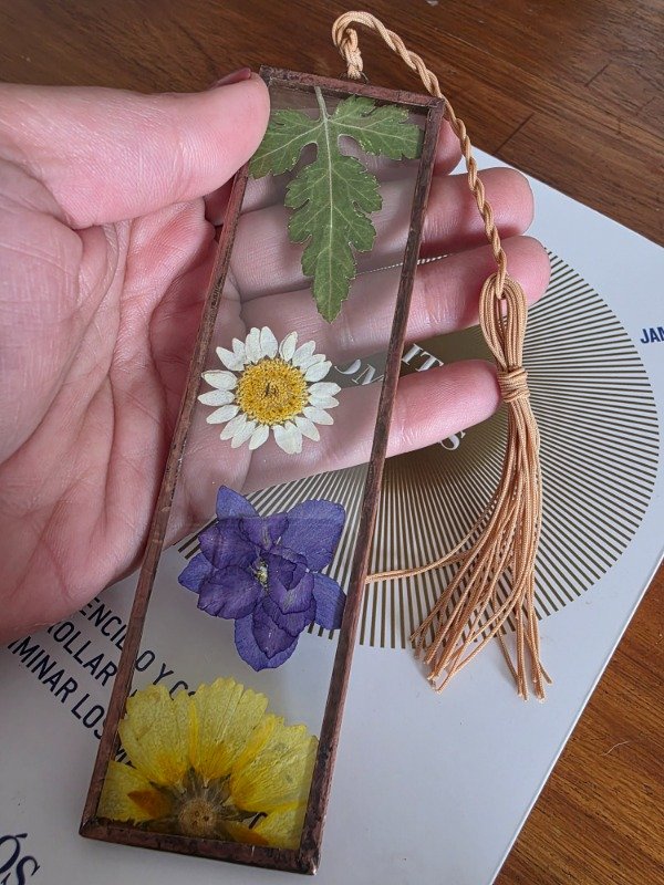 Este señalador está realizado en vidrio soldado en técnica Tiffany, con flores secas prensadas 🌸. Su diseño permite no solo marcar la página, sino también usarlo como guía de lectura para seguir cada renglón con calma 🌿.